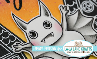 This week’s theme at la-la land is USE CLEAR STAMPS! I decided to make a cute spooky Halloween card using one of the older clear stamp sets from my stash. This is a slimline card which measures 4″x8″. First I made a background with Distress Oxide inks. Then I heat embossed those cute houses on black cardstock and fussy cut them.