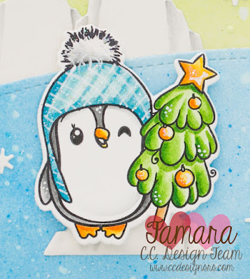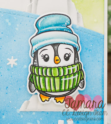 Tamara here with you with my latest card for C.C. Designs. I used Cute Penguins clear stamp set and made a Christmas card with them. There are 5 penguins in this set with three sentiments.