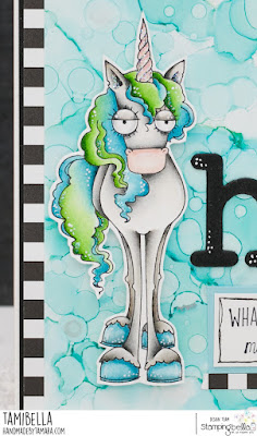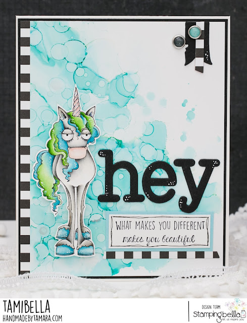 Tamara here with you.This week I’ve been playing with my alcohol inks and made a background for this awesome Oddball unicorn. I used teal and silver for the background and then coloured up my unicorn in teal-green combination.