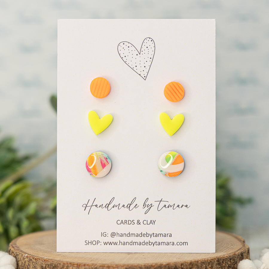 Set of three youthful, fun, modern shaped dangle earrings with neon effect (which means they glow under UV light). They are lightweight and very comfortable to wear. You can wear them for work, fun, coffe date and to hang out at your friends. They are perfect accessory for SUMMER!!!